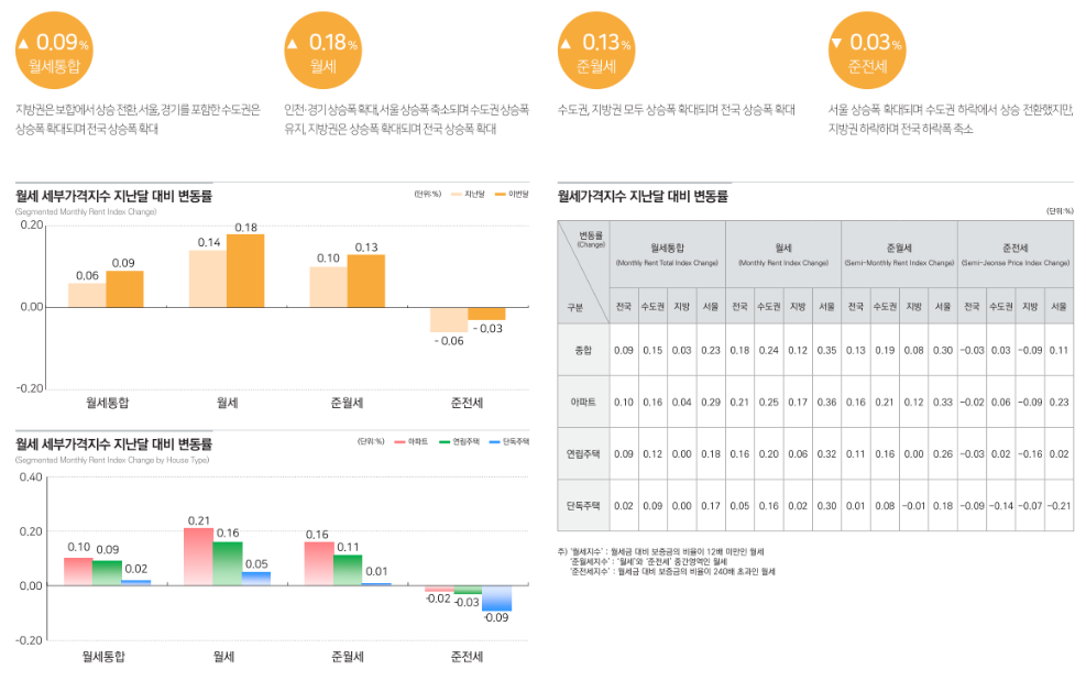 월세가격지수는 전국적으로 0.09% 상승했습니다. 특히 눈에 띄는 점은 전세보다 월세가 상대적으로 강세를 보였다는 것입니다. 서울은 0.23% 상승했으며, 강남·송파·용산 등 핵심 지역에서는 월세 선호 현상이 뚜렷하게 관찰되었습니다. 이는 높은 금리 환경 속에서 전세 대출 부담을 피하려는 세입자들이 월세로 이동한 결과라고 해석할 수 있습니다.
