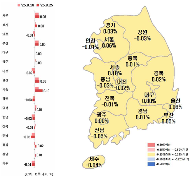 지방은 0.01%로 상승 전환했습니다. 세종(0.10%)이 상승폭을 키웠고, 울산(0.06%)과 부산(0.05%)도 오름세를 이어갔습니다. 반면 전남(-0.05%), 제주(-0.04%), 강원(-0.03%) 등은 하락했습니다.