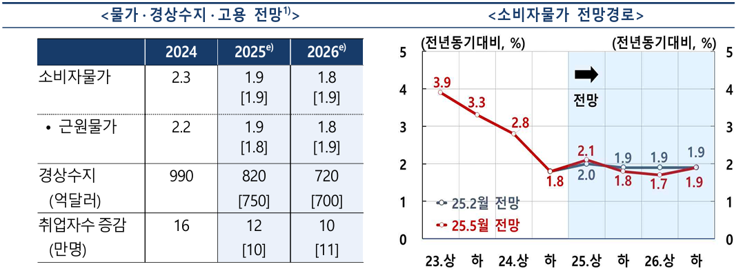 물가 상승률은 1.9%로 안정세를 보일 것으로 예상되지만, 이는 유가 하락과 내수 위축이라는 '불황형 안정'입니다. 서비스업과 가공식품 가격은 꾸준히 오르고 있어 소비자 체감 물가는 여전히 높은 수준입니다.
