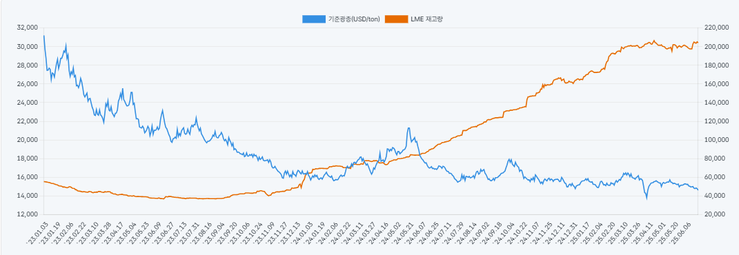무엇보다 콩고민주공화국의 Kamoa-Kakula 광산이 지진 피해로 인해 가동 중단되며 연간 생산량이 28%나 하향 조정됐습니다. 여기에 미국의 구리 제품 관세 부과 우려가 겹치면서 선제적 수요가 증가했고, LME 재고는 9주 연속 감소해 전주 대비 11.6% 급감한 104,950톤을 기록했습니다.